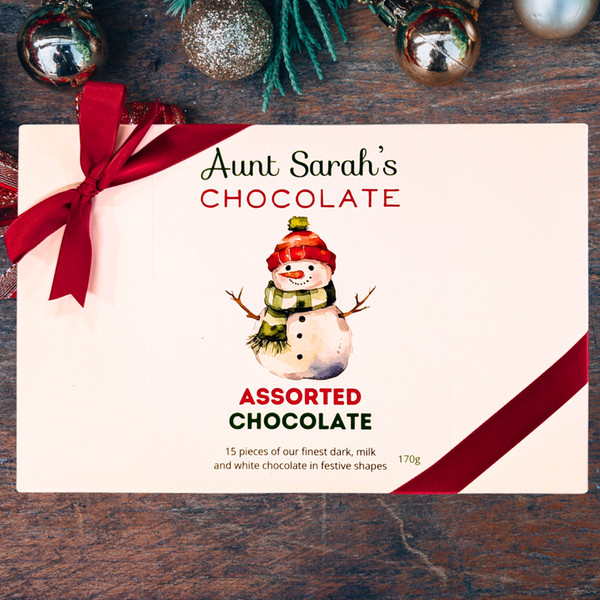 15 assorted holiday shaped pieces of our finest chocolate, packaged in a festive gift box with a hand tied bow. This assortment includes: milk chocolate wild strawberry, milk chocolate caramel, dark chocolate with NL sea salt and caramel, dark chocolate orange, milk chocolate coconut and white chocolate raspberry. Both cover options contain the same chocolate assortment.