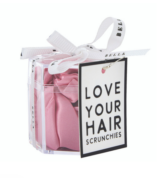 Treat yourself to better hair days with our silky satin scrunchies! Bella's satin scrunchies keep your hair tangle free, protecting it from breakage. These adorable scrunchies make the perfect self-care gift.  100% Polyester.