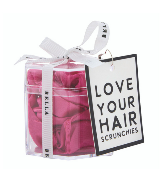 Treat yourself to better hair days with our silky satin scrunchies! Bella's satin scrunchies keep your hair tangle free, protecting it from breakage. These adorable scrunchies make the perfect self-care gift. 100% Polyester.