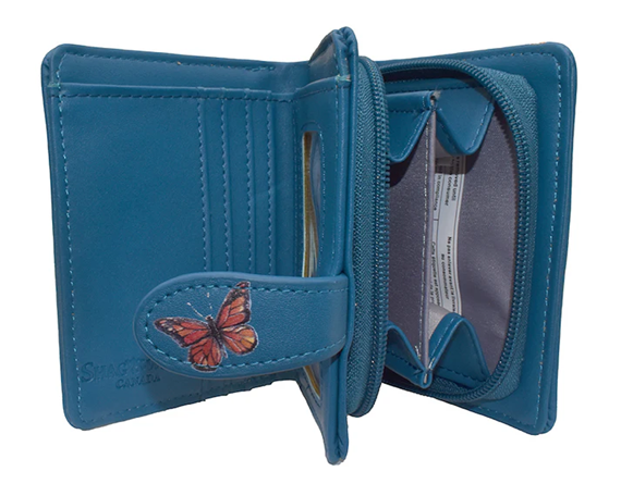 Small Wallet with Button Closure, Zipper Compartment, 5 Card Slots, Clear ID Slot, Bill Compartment. Durable Vegan Leather. 4.5" x 3.5".